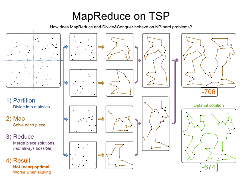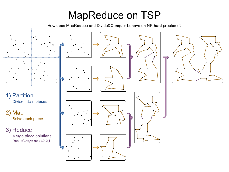 To solve a planning or optimization problem, some solvers tend to scale out poorly: As the problem has more variables and more constraints, they use a lot more RAM memory and CPU power. They can hit hardware memory limits at a few thousand variables and few million constraint matches. One way their users typically work around such hardware limits, is to use MapReduce. Let’s see what happens if we MapReduce a planning problem, such as the Traveling Salesman Problem.