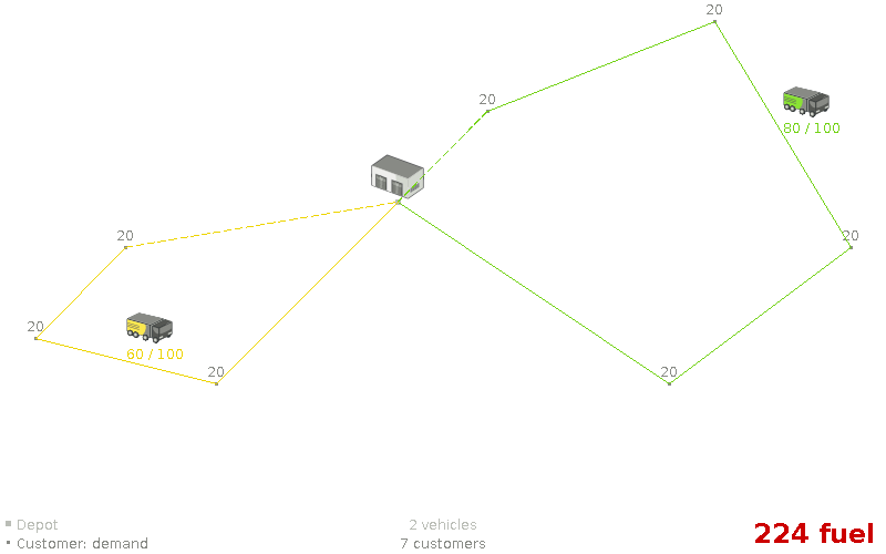 This optimal solution requires 224 fuel, which is - of course - more than the 210 fuel of the previous solution. The yellow truck transports 60 items and the green one 80 items.