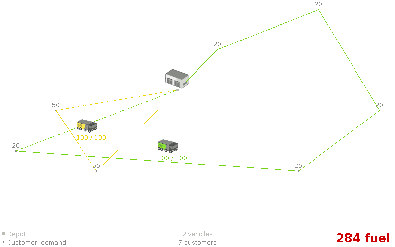 The optimal solution now requires even more fuel: 284. We found a feasible solution with 2 vehicles.
