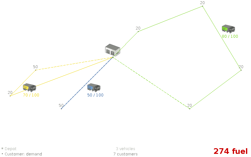 By adding an extra vehicle, the optimal solution now uses less fuel: only 274. This is a paradox: buying more vehicles can reduce expenses.