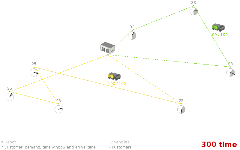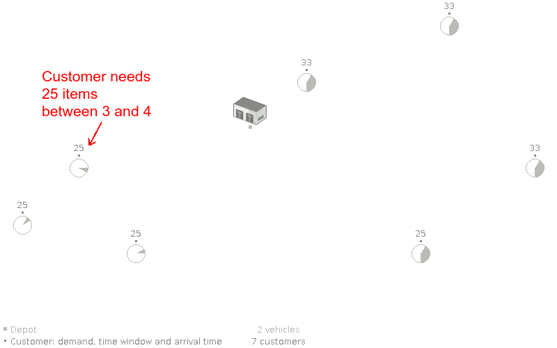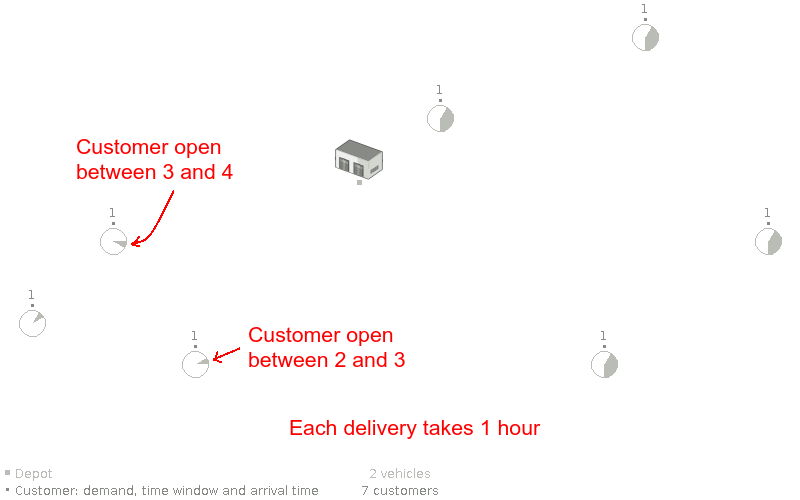 In the case above, a vehicle needs to arrive at the top left customer between 3 and 4 o’clock. Different customers have different time windows. For example, all 4 customers on the right are flexible: they are available between 1 and 6 o’clock. Additionally, each delivery/pick up/repair at a customer takes 1 hour to complete.