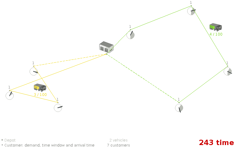 In the optimal solution, the yellow truck arrives at the most left customer at 1 o’clock. An hour later it leaves for the bottom left customer at which it arrives at 2:20 (because driving takes some 20 minutes). Again an hour later it departs and arrives at its 3rd customer at 3:40.