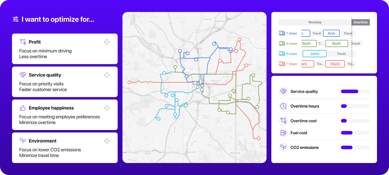 Why wrestle with complex scheduling and routing when an API can handle it for you? Solve the operational complexity of field service while keeping your workforce at the center. Fairer schedules, increased customer satisfaction, and more efficient operations.