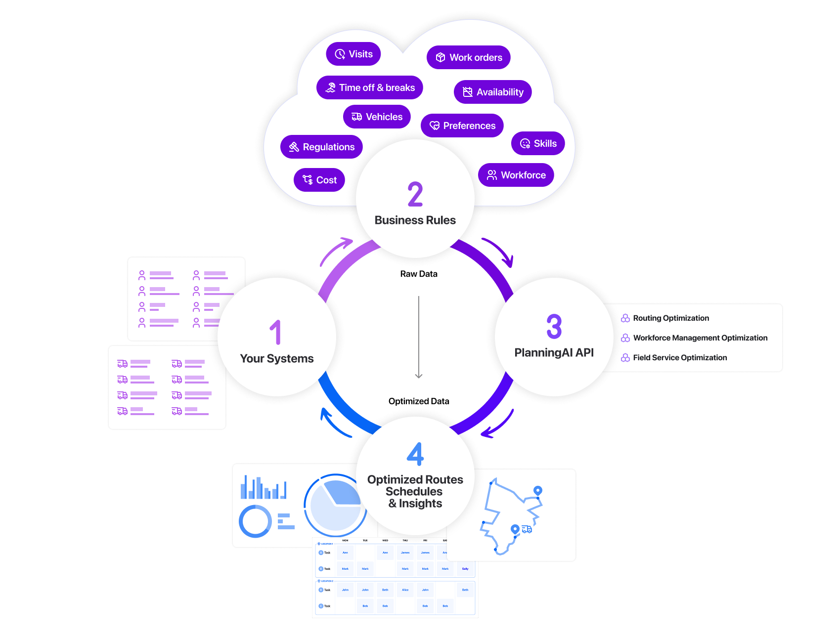 Timefold’s ready-to-use route optimization API transforms your operational data like work orders, technician skills, locations, and schedules into fully optimized daily plans. Feed your CMMS or maintenance management data, and get back task assignments and routes that minimize travel and maximize output.